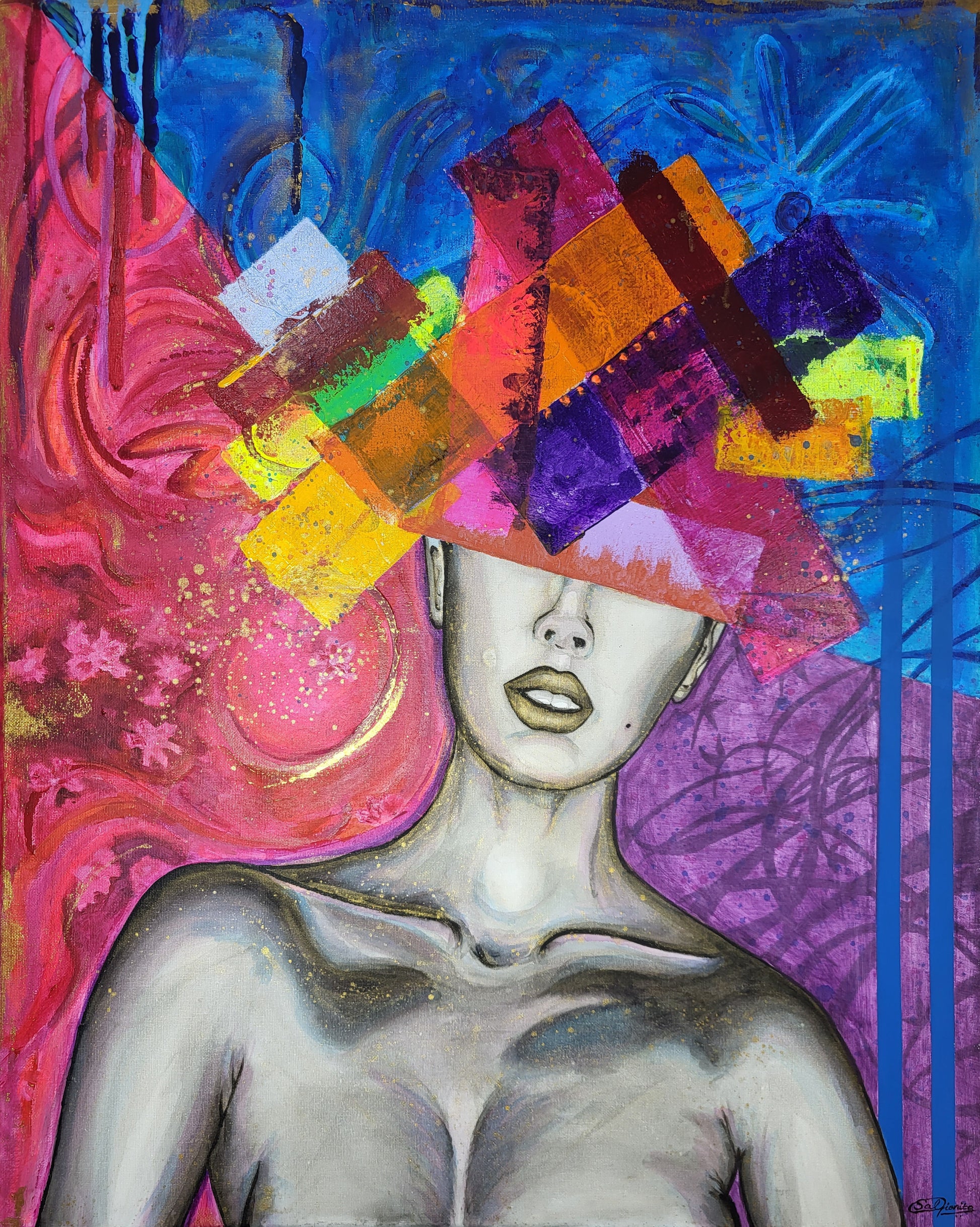 Maura flawlessly draws on the feminine symbolisms of Springtime’s flourishing strength and elegance; boldly displayed in her nonchalant posture and the subtle intricacies of the piece; conveying the spirit of a modern woman with confidence and poise. The vivid hues exude a theme of regality and elegance at once combined with a burst of ethereal colour, carnal, outspoken and yet delicate captured within the unique composition of this piece. This work was inspired by the concept “Unstoppable”.