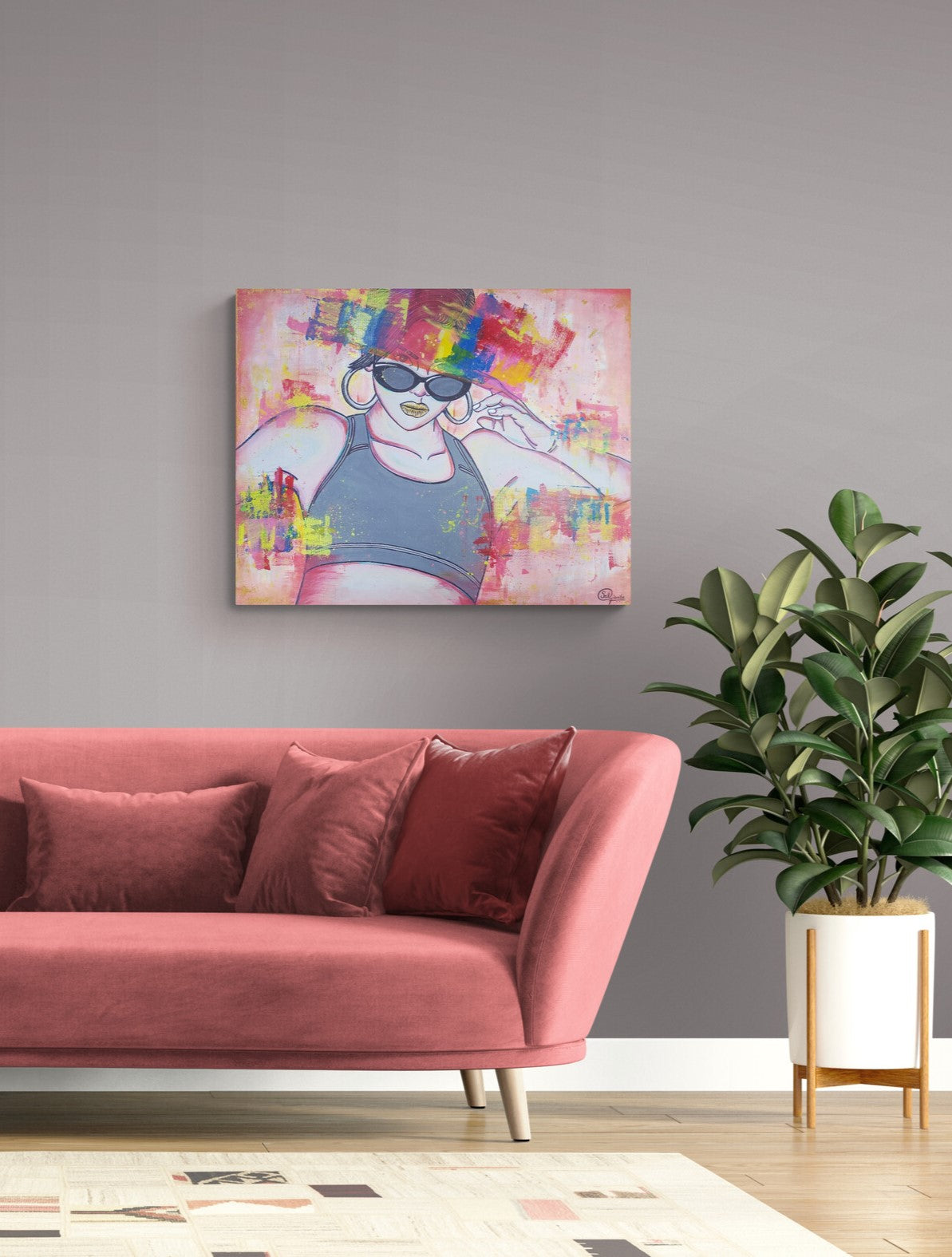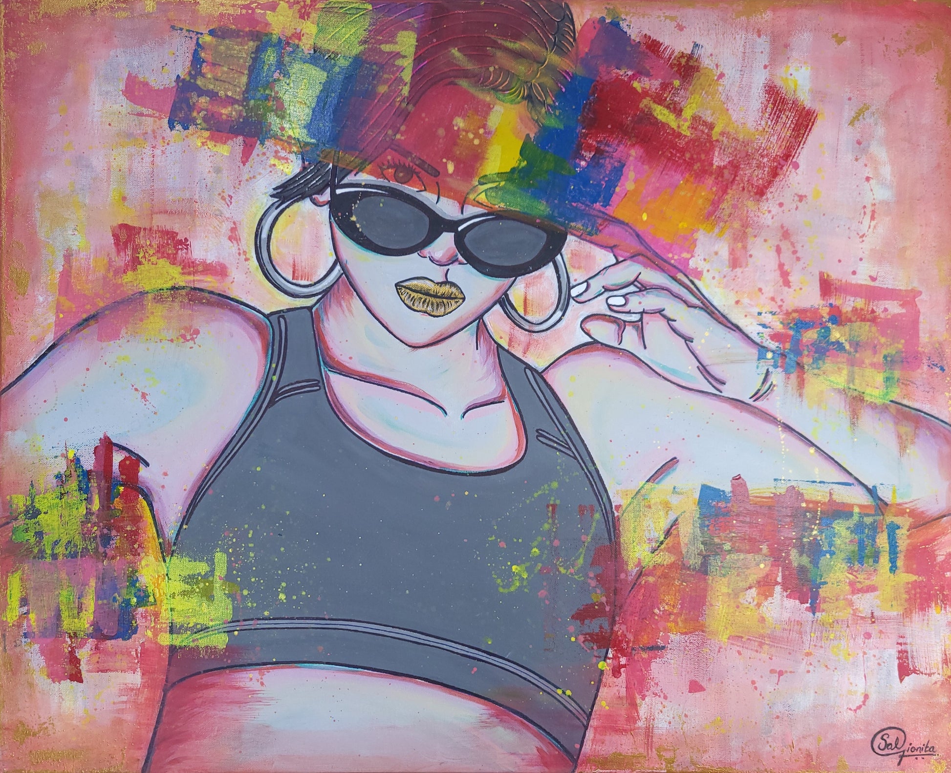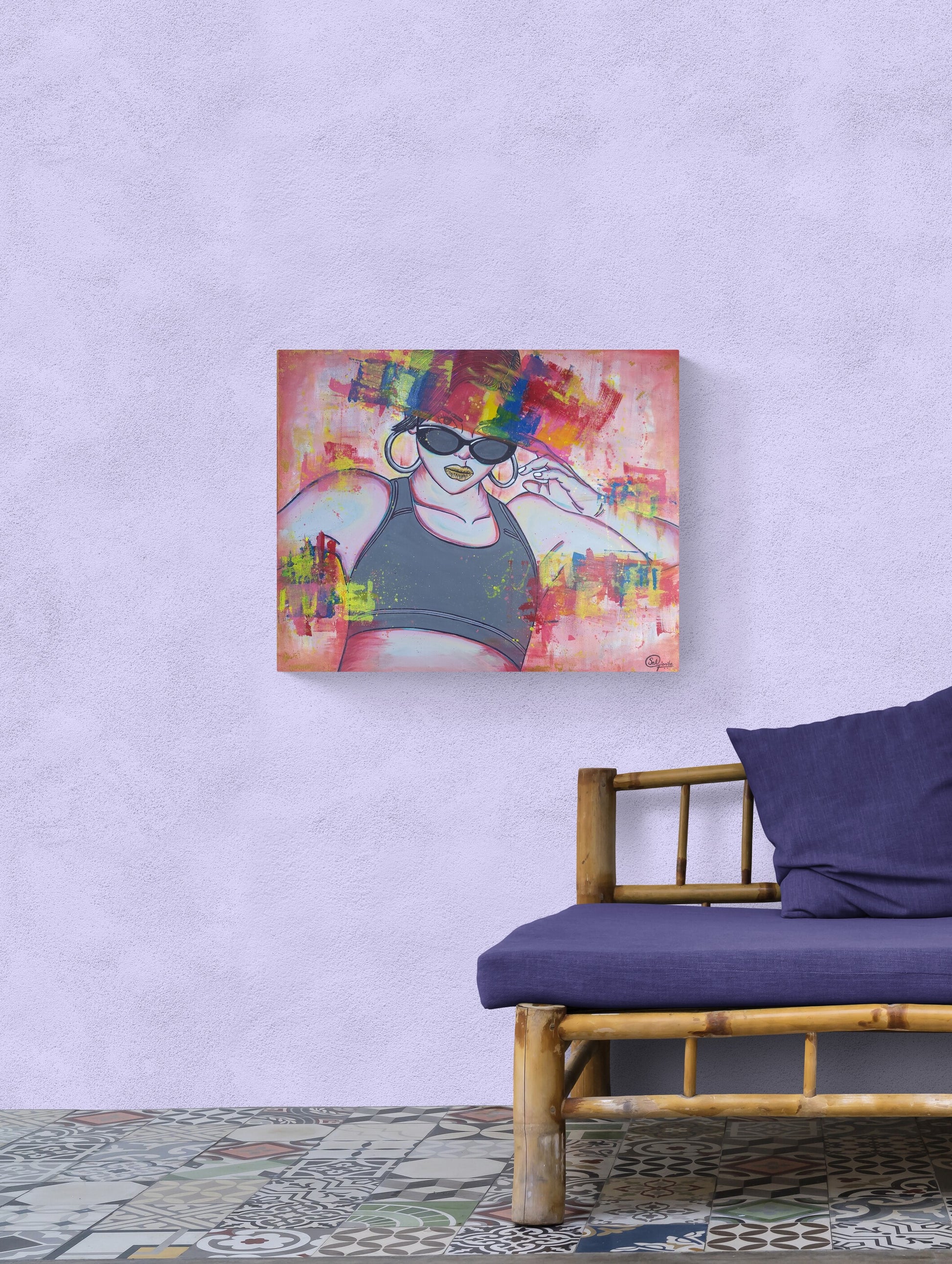 Salena champions and celebrates her perceived flaws, defying societal standards and enchanting and intriguing those who come into contact with her. Fun and frivolous, this modern, sexy bold art piece playfully juxtaposes opposing elements in perfect harmony. It captures a woman’s wondrous complexity by merging the sweet alluring qualities of baby pink shades and tuberose tones blended seamlessly with harsher notes of yellows, blues and reds generating a captivating mélange. This dynamic composition was crafted to reflect the concept of the word “Resilient”.